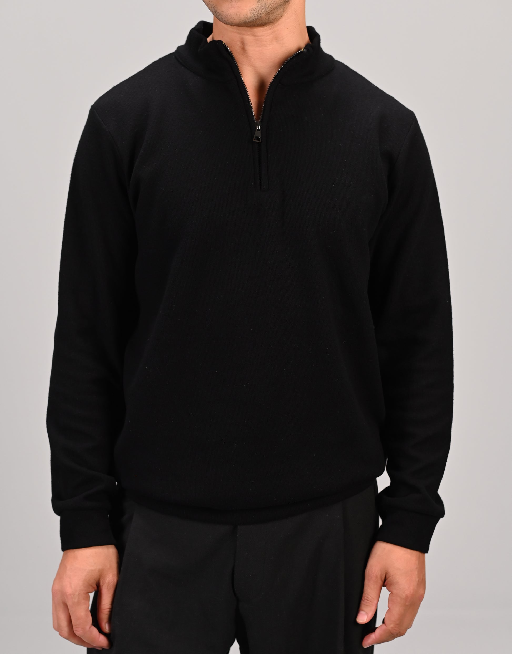 A black quarter zip sweater that gives effortless boss energy. Crafted from soft cashmere for a smooth, chic feel- a clean, timeless piece with natural confidence.