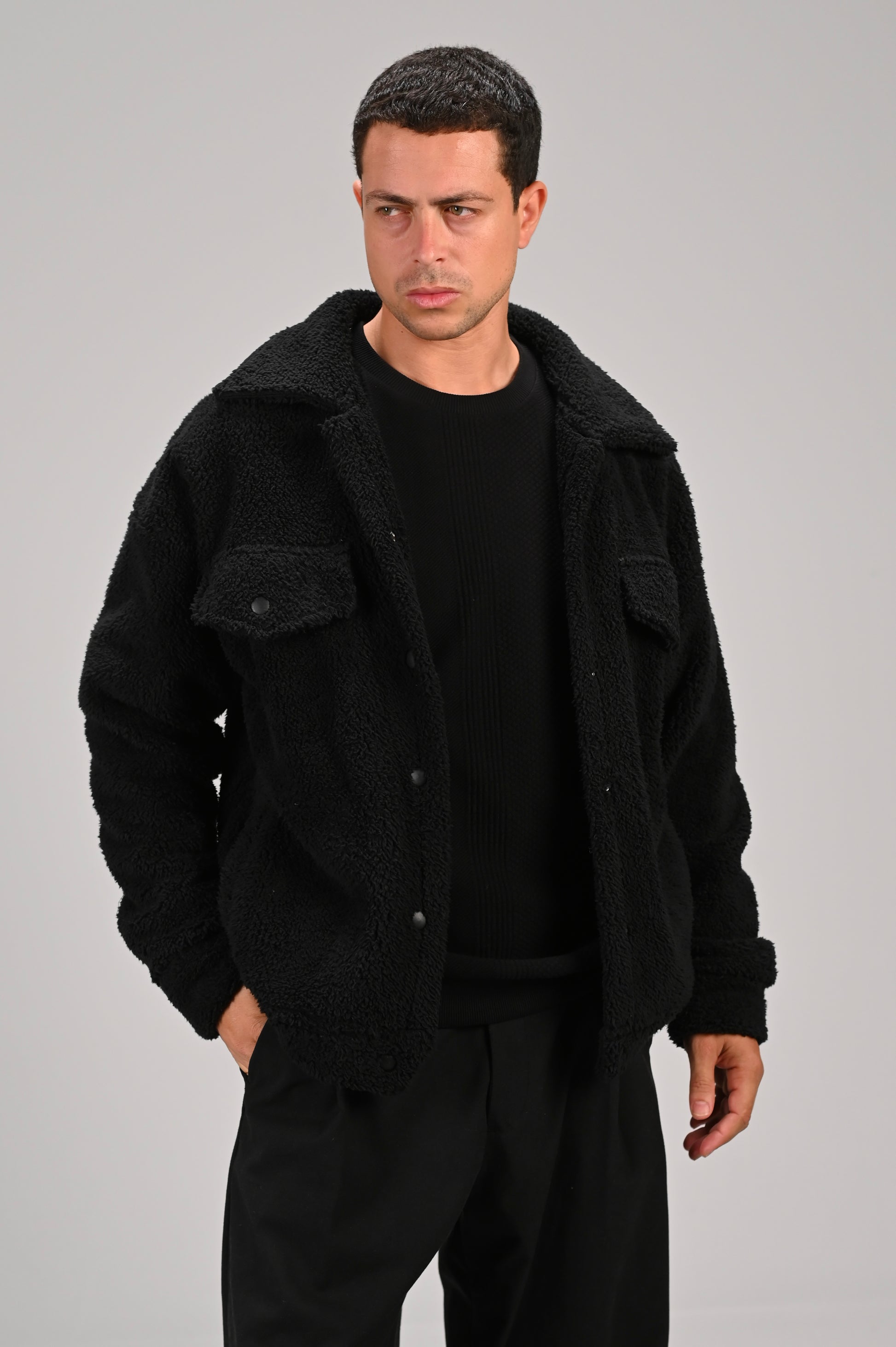 A Soft black teddy jacket with a relaxed cut and a plush, textured finish. It's lined with subtle grey check detailing on the inside for an elevated touch. Finished with snap buttons and chest pockets. Pairs perfectly with our black essential black knit.