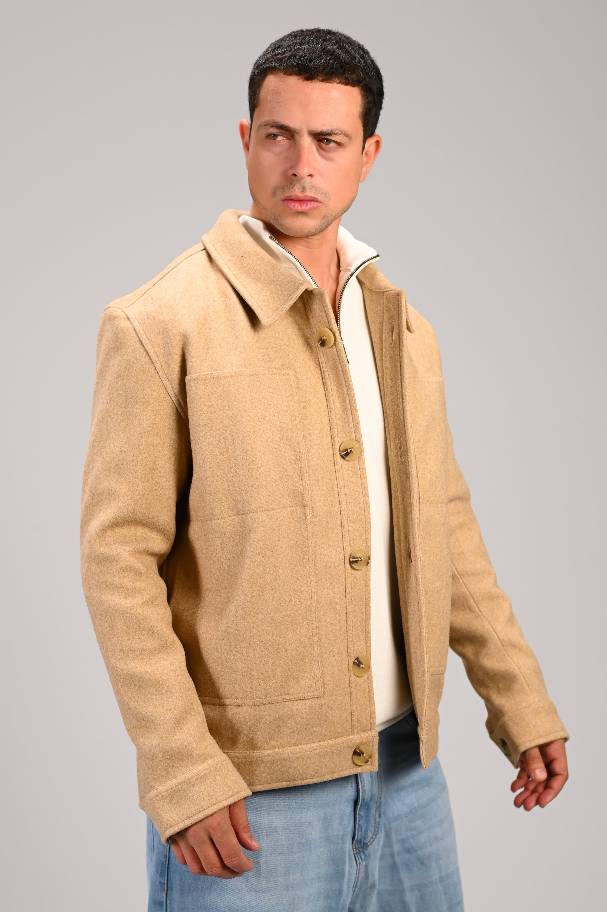 A Soft Wool Blend Camel Jacket with a smooth feel and a clean, structured look that pairs easily with our Alpha Cream Zip Sweater.