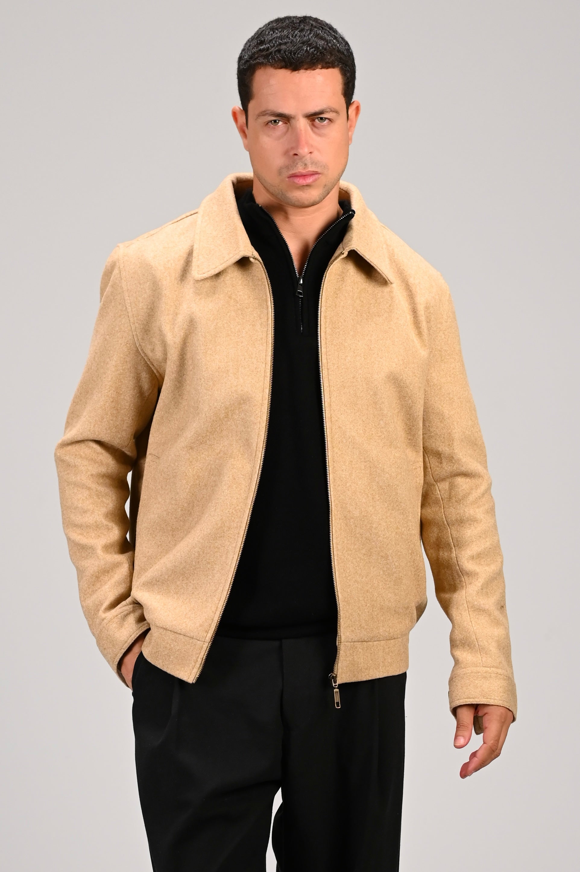 A soft wool blend camel jacket with a smooth feel and a clean, structured look that pairs easily with our Alpha Black Zip Sweater.