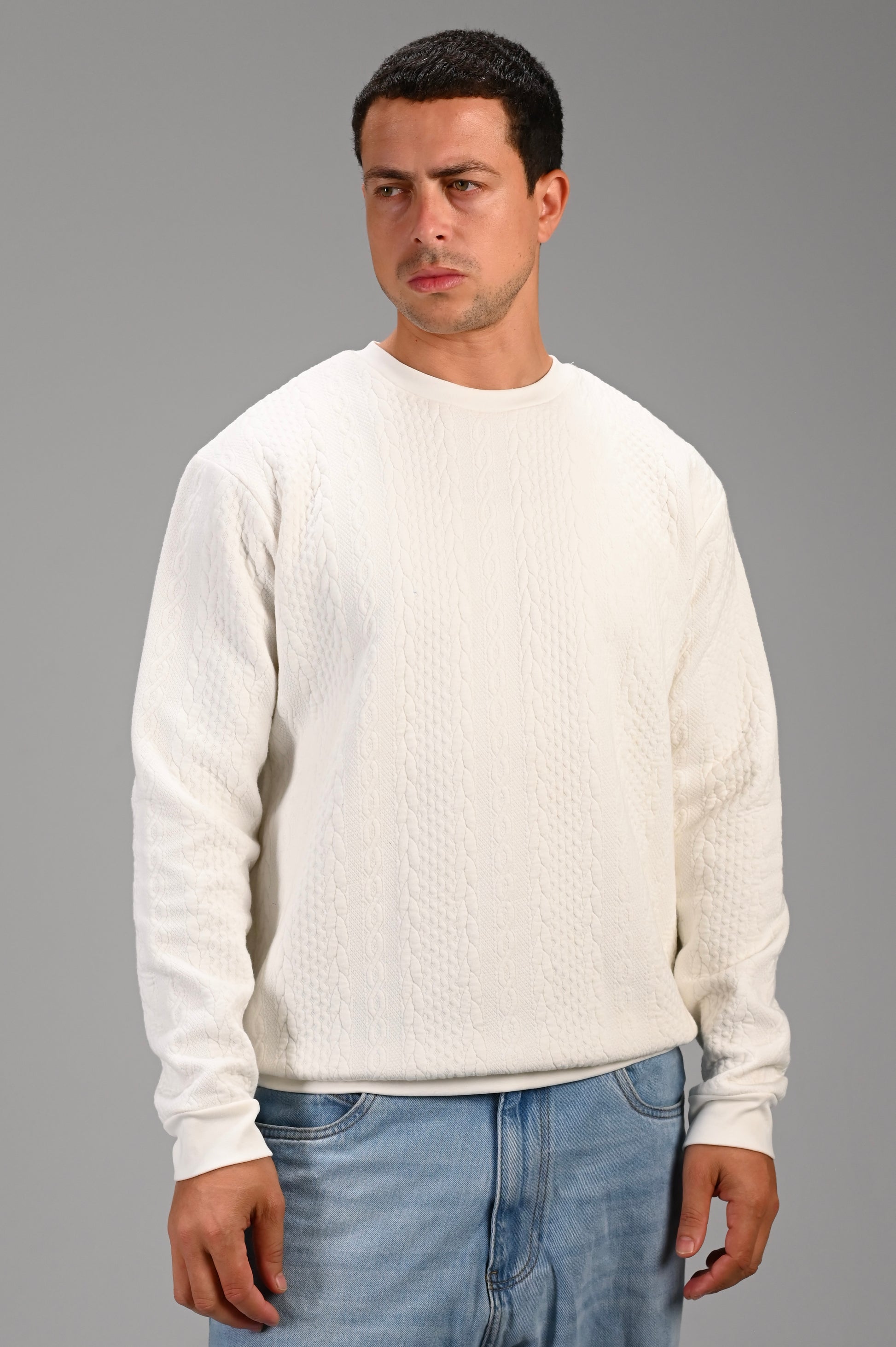 A white knit sweater with a clean crewneck cut and a textured knitted pattern that gives it subtle movement instead of a plain finish. Soft, structured, and easy to style with any look.